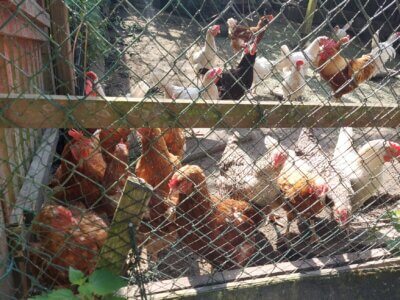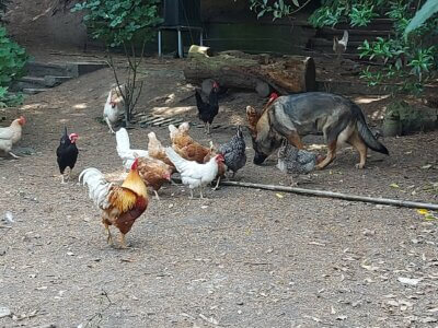 Der Garten hinter dem Haus ist ein Paradies für die Tiere, es leben auch noch zwei Schäferhündinnen und drei Katzen dort und alle verstehen sich prächtig. Wer helfen möchte, kann den Verein durch Patenschaften für Hühner, Adoption von Hühnern oder einfach durch Geldspenden unterstützen. https://huehnerrettung.de/