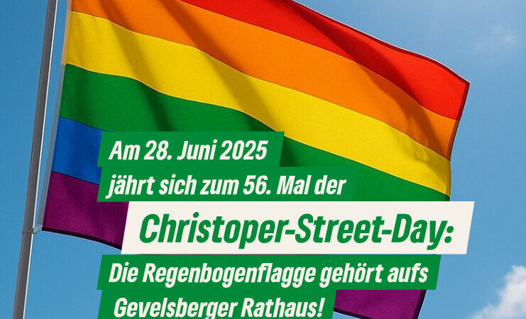 in den kommenden Tagen feiern wir in Gevelsberg den Höhepunkt des Jahres: die beliebte Kirmes, die für Lebensfreude, Weltoffenheit und Toleranz steht. Alle Menschen unserer Stadt und darüber hinaus sind herzlich eingeladen, gemeinsam und friedlich in ihrer Vielfalt zu feiern – für unser offenes, demokratisches Lebensmodell. Aus aktuellem Anlass bitten Bündnis 90/Die Grünen die Stadt Gevelsberg, zum 56. Jahrestag des Christopher Street Days (CSD) am 28. Juni ein Zeichen der Solidarität zu setzen. Neben der Stadtflagge und der Kirmesfahne schlagen wir vor, auch die Regenbogenfahne zu hissen.