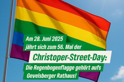 Zum 56. Jahrestag des Christopher Street Days (CSD) sollte auch vor dem Gevelsberger Rathaus die Regenbogenflagge wehen. Wir haben Bürgermeister Jacobi dazu angeschrieben: Sehr geehrter Bürgermeister Jacobi, in den kommenden…